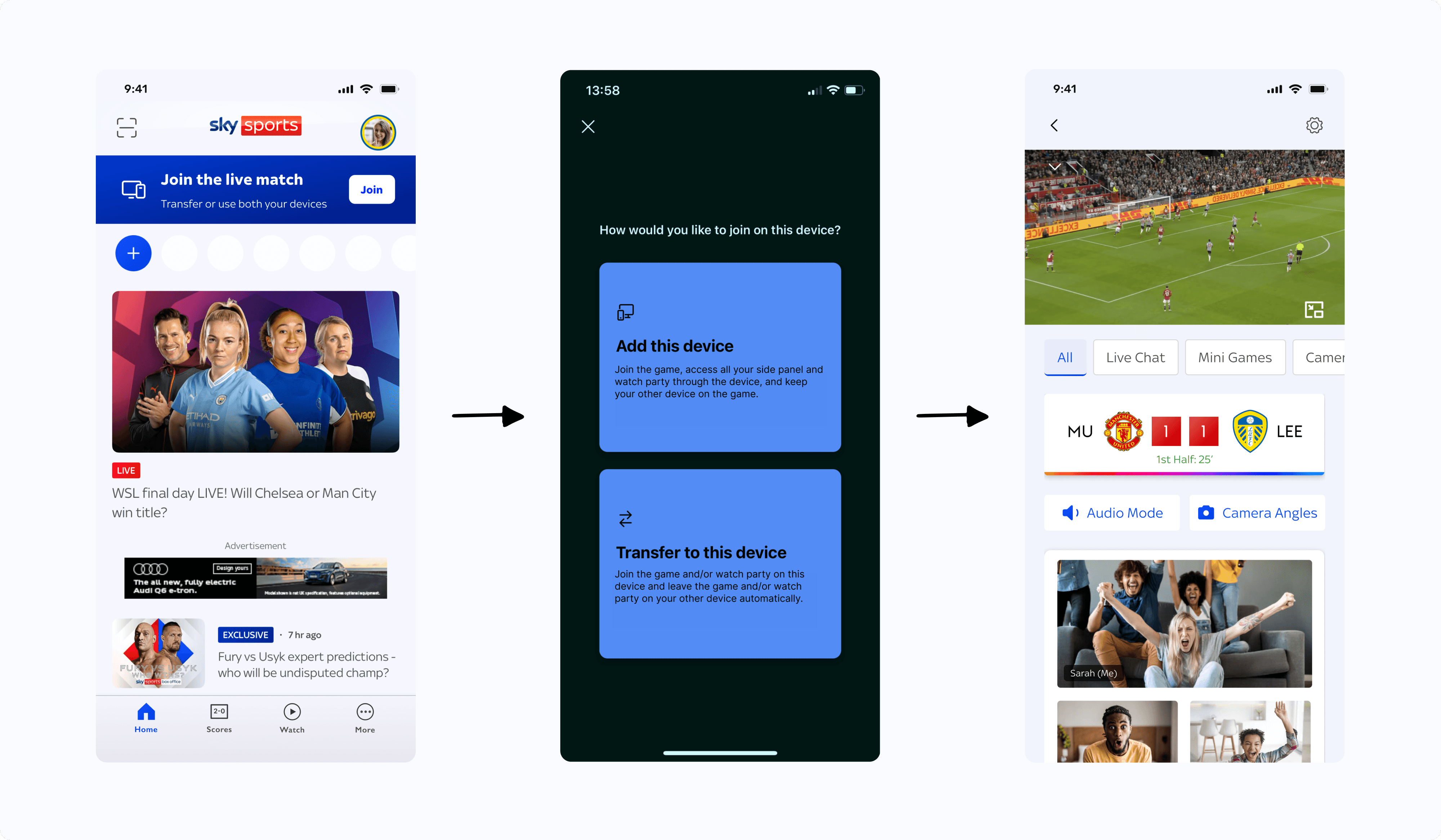 When a user wants to switch from watching a game on their phone to a larger screen, they can log in to the Sky Sports website and receive an in-app notification to access the game with one click. Alternatively, they can use the 'Watch' tab on the website.